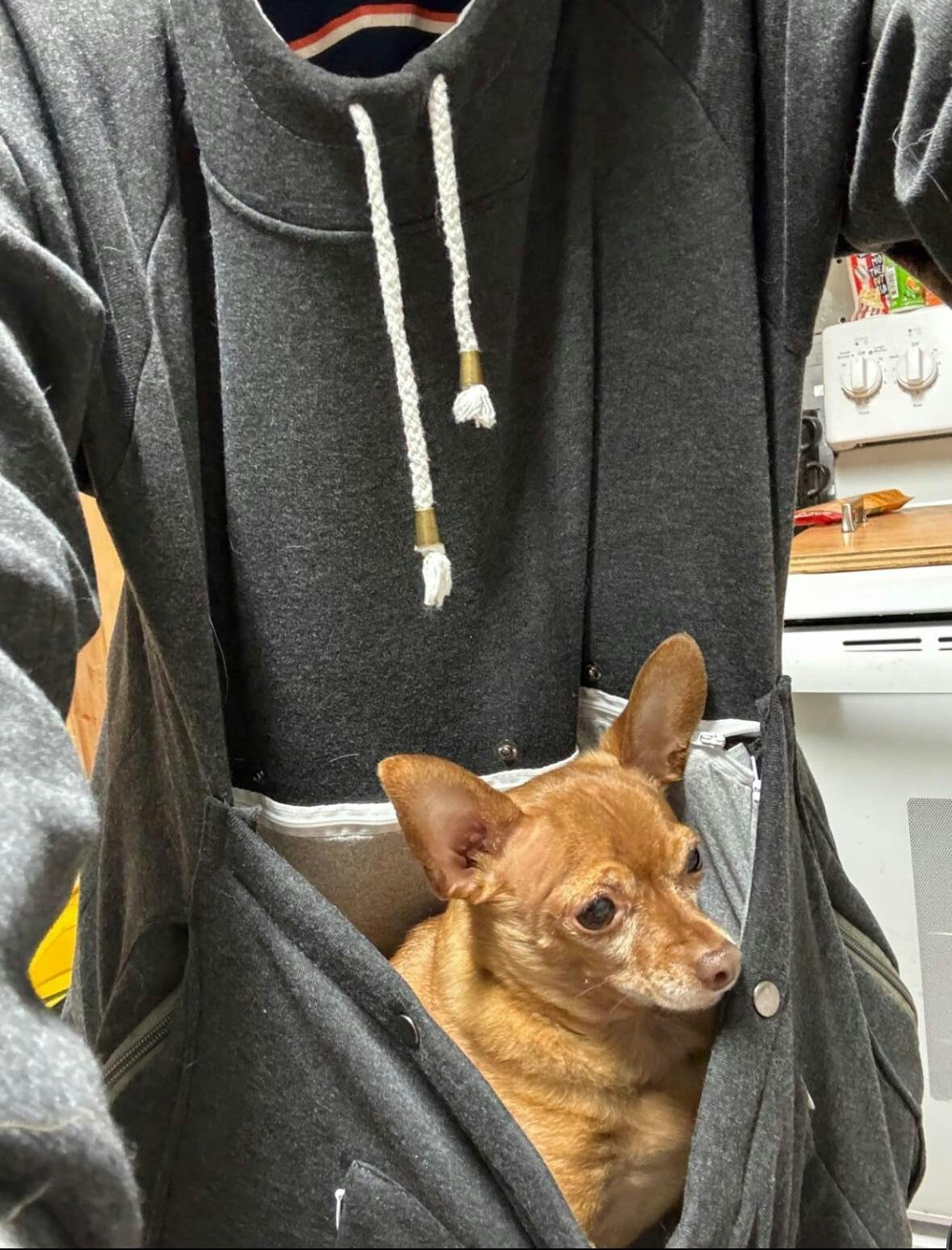I carry my7 lb. dog around all the time when I’m doing chores around the house. She really likes
