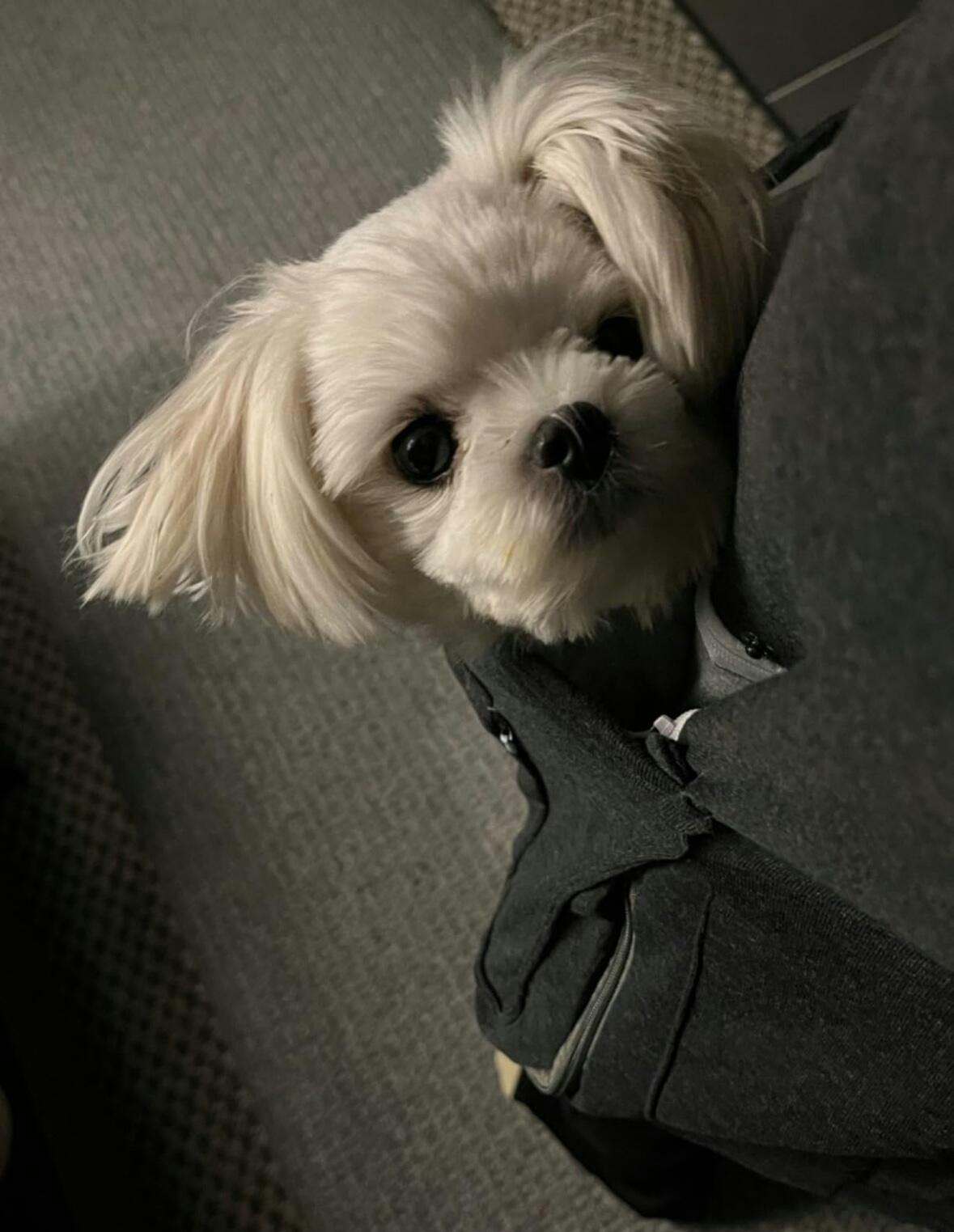 My little Maltese loves this cocoon. I wear a small, but I bought a large to give him extra room. He fits with plenty of room to spare for both of us. It’s super comfy and very well made. It has additional space in front of the pouch for pockets. Lots of zippers and snaps to secure my pup and belongings.